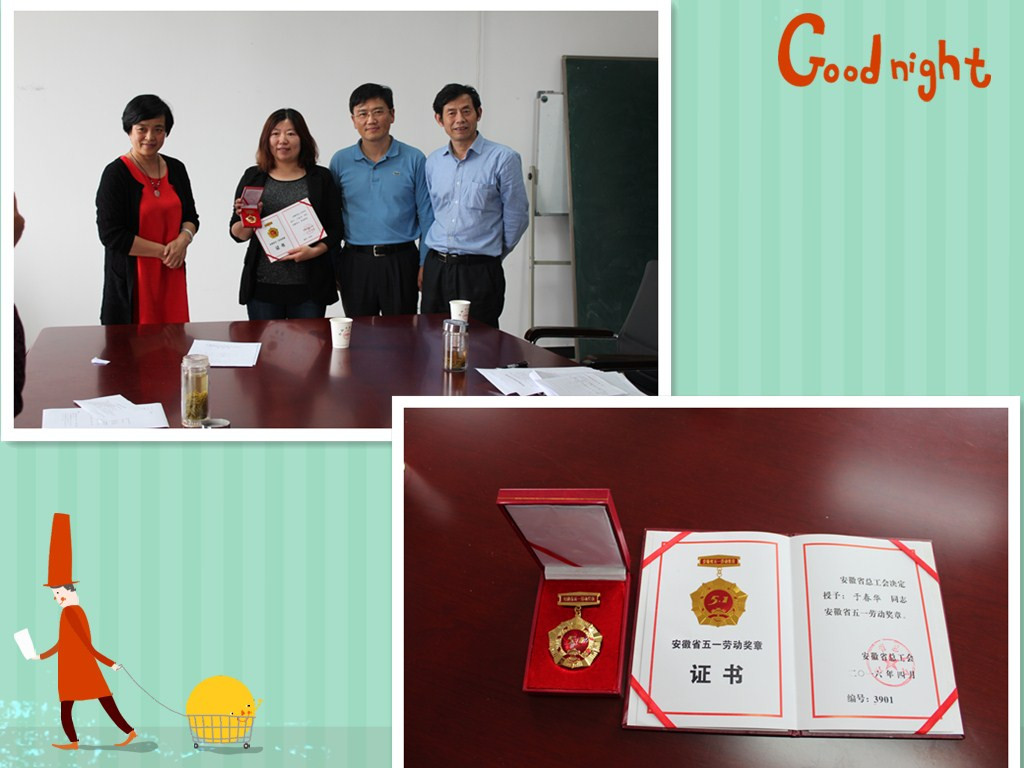 5月24日下午,校工会主席赵恩秀、教务部部长陈翌庆来到我院,热烈祝贺我院青年教师于春华同志获得安徽省“五一”劳动奖章,并为于春华同志颁发奖状和奖章。 会上,校工会赵主席说,于春华自参加米兰MILAN(中国)、学校、安徽省青...