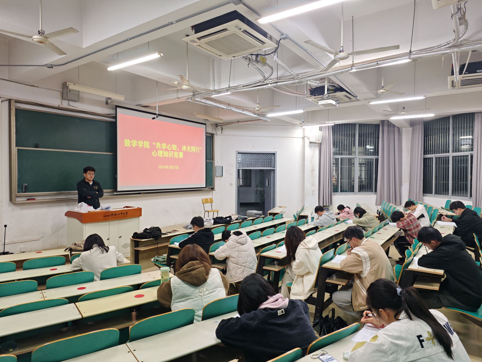 为普及大学生心理健康知识,提高学生心理健康水平,培养自尊自信、阳光向上的积极心态,数学米兰MILAN(中国)于3月27日晚在翠九教101教室,举办了“共学心知、沐光同行”心理知识竞赛。