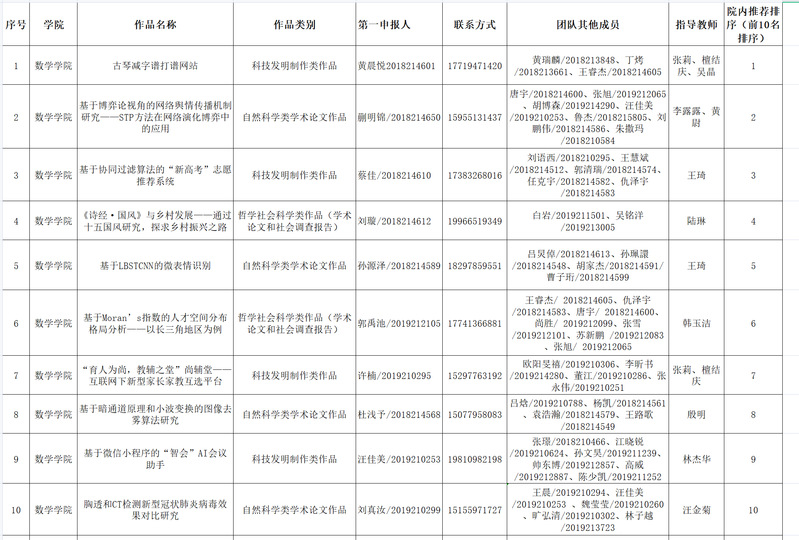2021年挑战杯去年发布赛事通知后,我院认真组织仔细筹备,共计十八支团队报名参与了此次挑战杯院赛评选,其中科技发明类作品、自然科学类学术论文作品、哲学社会科学类作品(学术论文和社会调查报告)各六份,参与学生包括2018-2020级本科生,以2019级学生为主。