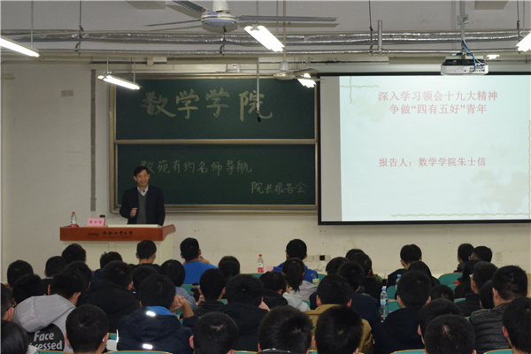 朱士信首先结合自身经历和数学学科特点,对十九大精神进行了解读,着重对“双一流”建设,尊师重教,全方位公共就业服务,倡导创新文化,聚天下英才,鼓励引导人才流动,青年兴则国家兴,关心和爱护青年,坚定理想信念等九个关键词进行了深入剖析;随后,结合数学分析典型例题,分析了题目之间的内在联系,强调讲究学习方法的重要性;最后,结合杨同海教授的成长历程,阐释了青年人要有决心,有毅力,光芒的背后必有惊人的付出,他指出“学习知识,培养能力,培养自信心是大学生活最重要的三件事。要抓住机会,不要输在起跑线上!”在互动环节,朱士信就如何处理好工作与学习的关系与同学们进行了交流。朱士信风趣幽默、博识睿智的大师风范,深深感染了在座的每一位同学,报告会现场掌声不断,同学们纷纷表示受益匪浅,收获颇丰。