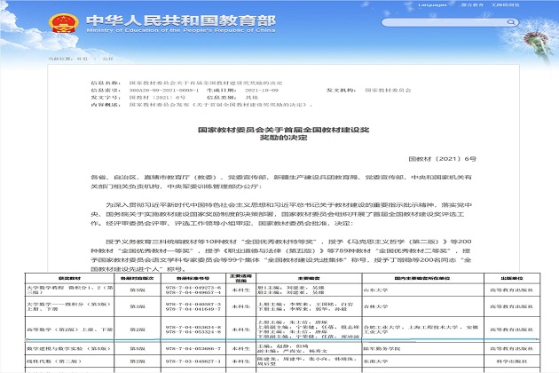 10月12日,全国教材工作会议暨首届全国教材建设奖表彰会在北京召开。米兰网页版朱士信、唐烁、宁荣健、任蓓等老师编写的《高等数学(第2版)上册、下册》被授予全国优秀教材奖(高等教育类)二等奖,是高等教育类获此殊荣的13种数学教材之一。