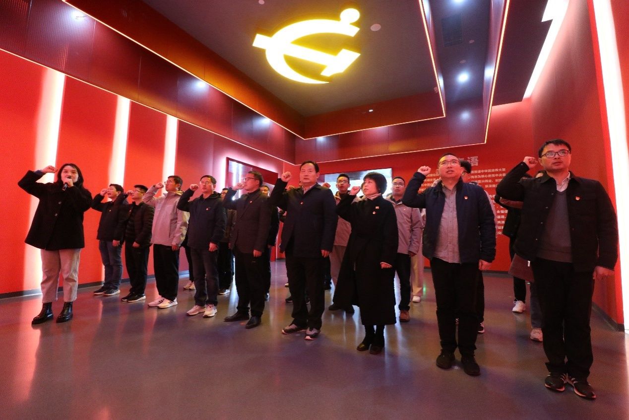 在宣誓厅,全体人员面对党旗举起右拳集体宣誓,重温入党时的庄严承诺。