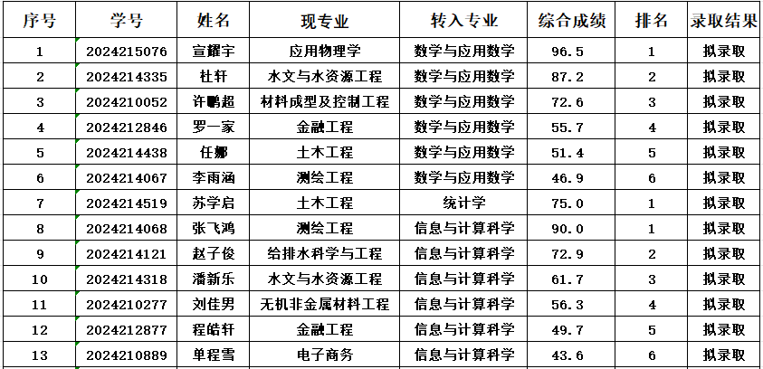 根据《合肥工业大学普通全日制本科生转专业管理暂行办法》(合工大政发〔2024〕70号)(以下简称《暂行办法》),经米兰MILAN(中国)组织的笔试和面试考核,按考核总成绩高低进行排序,提出拟录取名单,其中,数学与应用数学6人、统计学1人、信息与计算科学6人。现对拟录取名单予以公示。