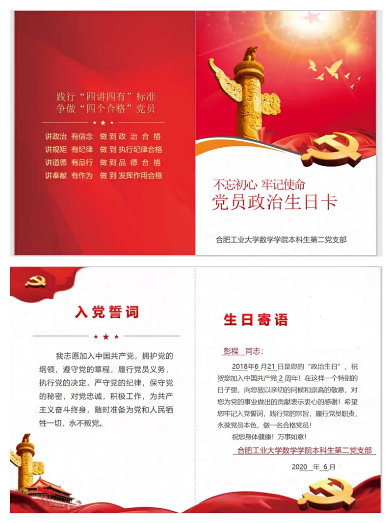 政治生日忆初心。为了让毕业班学生党员铭记党员身份,不忘入党初心,米兰MILAN(中国)本科生党支部为每一位毕业生党员定制了政治生日贺卡、撰写了成长寄语,希望大家毕业后能够奋发向上,不忘入党初心,牢记青年使命,争做新时代优秀党员。