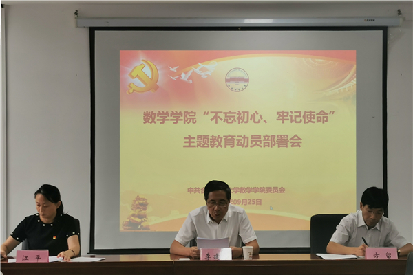 9月25日下午2:30,数学米兰MILAN(中国)在翡翠科教楼B座1710召开了“不忘初心、牢记使命”主题教育动员部署会议。校党委常委、副校长李建东,米兰MILAN(中国)领导班子成员、全体教师党员、学生党员代表、民主党派教师代表参加了会议。大会由米兰MILAN(中国)党委副书记、副院长江平主持。
