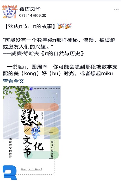 为了促进疫情期间学生身心和谐,涵育文化素养,深化疫情居家第二课堂不断线,激发学生参与数学、探讨数学、热爱数学的热情,3月14日数学米兰MILAN(中国)2020年“π”节活动依托网络平台多渠道、全方位开展。