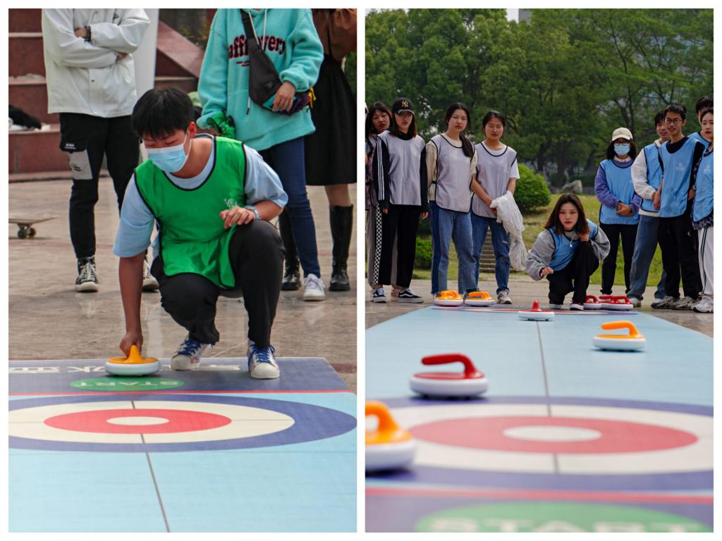 “数动青春 悦纳自我”冰壶趣味素质拓展活动在翡翠湖校区东风广场举行。活动将参与同学随机分为七组,采用组间对抗、循环淘汰的方式进行。小组成员间相互配合、默契交流,在团结与紧张的气氛中尽展智慧与胆识,每一名投掷员都努力把握冰壶的投掷方向与力度、尽力发挥自己的优势与智慧。经过激烈角逐,第六组获得第一名、第四组获得第二名。