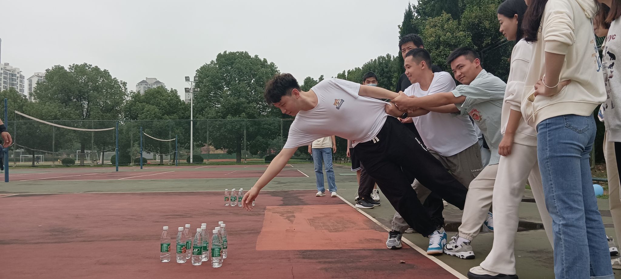 10月3日下午15时,素质拓展活动在排球场正式拉开帷幕。此次活动有你比我猜、同心协力、丢沙包、数字接龙、背靠背夹气球五个项目。队员按抽签的方式被随机分为四组,比赛采取积分制方式进行。在活动中每组队员全情投入、互相帮助、积极沟通,纷纷为自己的队伍献计献策,对于因紧张而失误的队友没有丝毫的埋怨,而是充满恳切的鼓励,充分发挥了集体协作精神,共同努力完成每一次活动。经过激烈比赛,最后红桃队和黑桃队积分领先分别斩获冠军、亚军,文体部负责人按排名为每个小组颁发奖品。