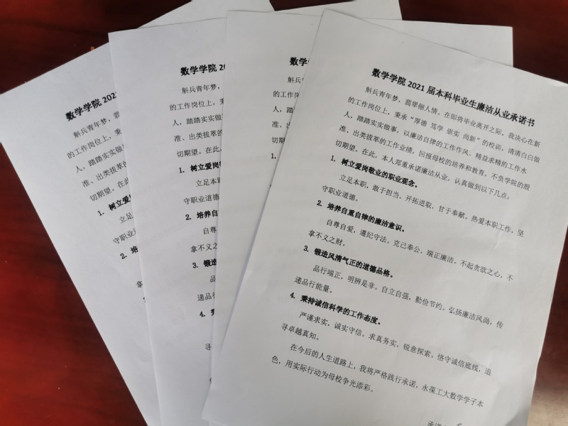 Sign the Integrity Pledge.All the students solemnly signed the “Promise of Integrity for 2021 Undergraduates of the School of Mathematics” and promised that they will set up professional concept of dedicatin to work, cultivate a sense of self-disciplinary integrity, forge a virtuous moral character, uphold honest scientific attitude of work and keep ture qualities of mathematicsl students of HFUT to add glories to university through practical actions after graduation.